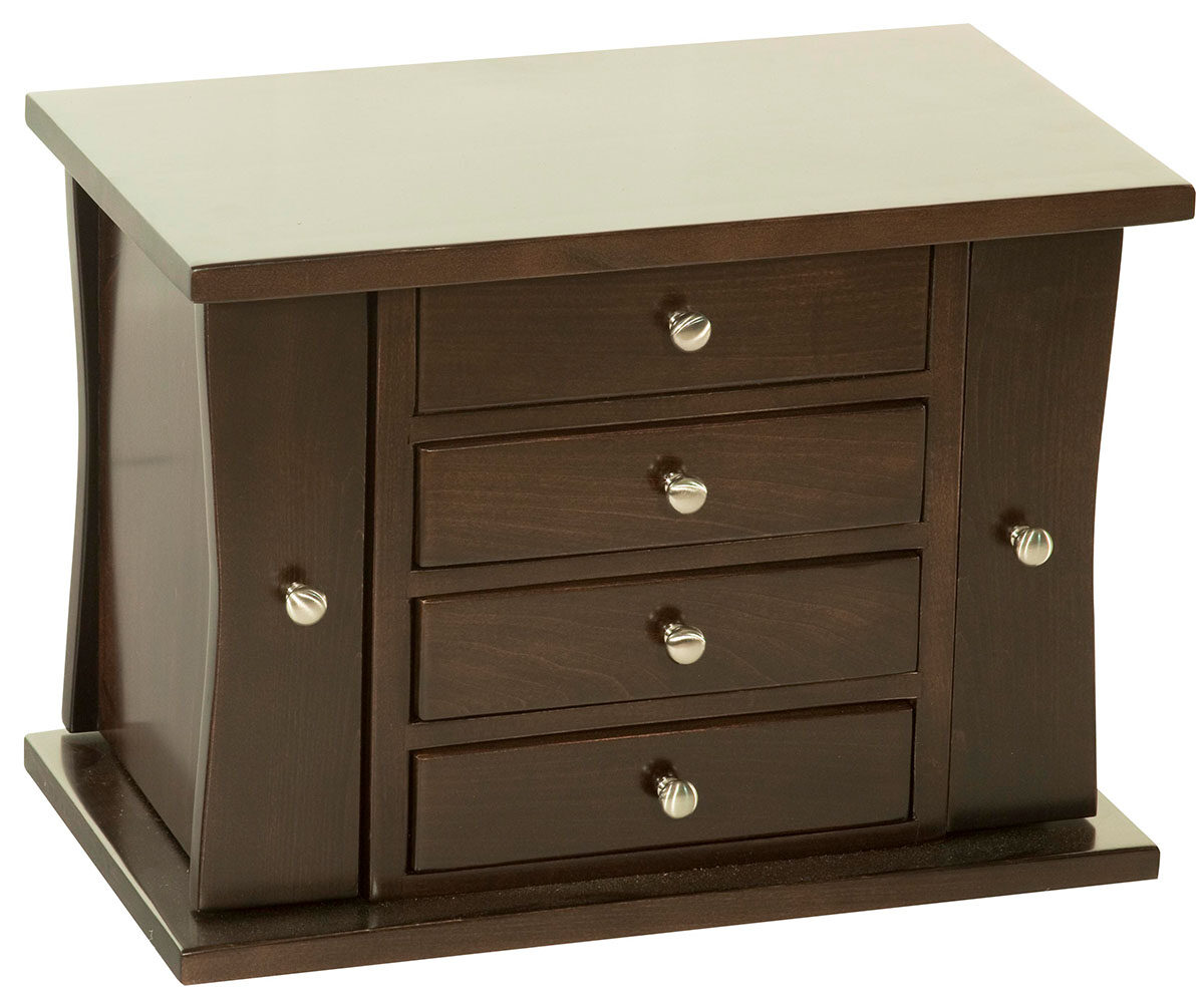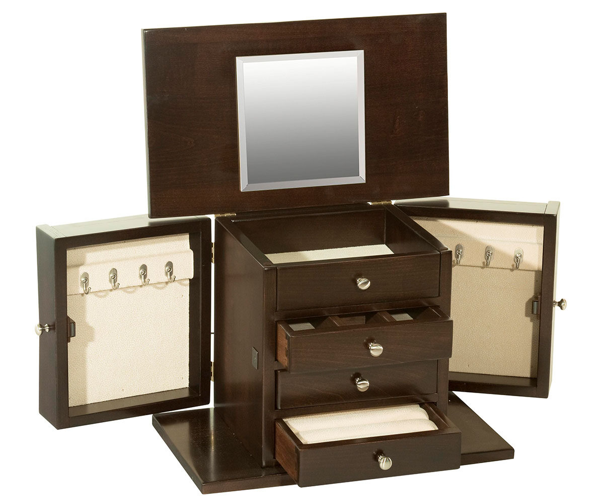 Features: • Dovetailed drawers • One ring drawer • One three section divided drawer • Necklace holder on each side