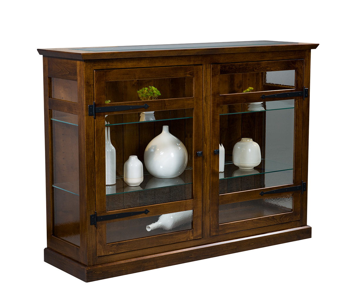 Features: • Shiplap back • Antique and beveled glass doors • Beveled glass top surface • LED touch lights • Two adjustable glass shelves • Strap hinge detail