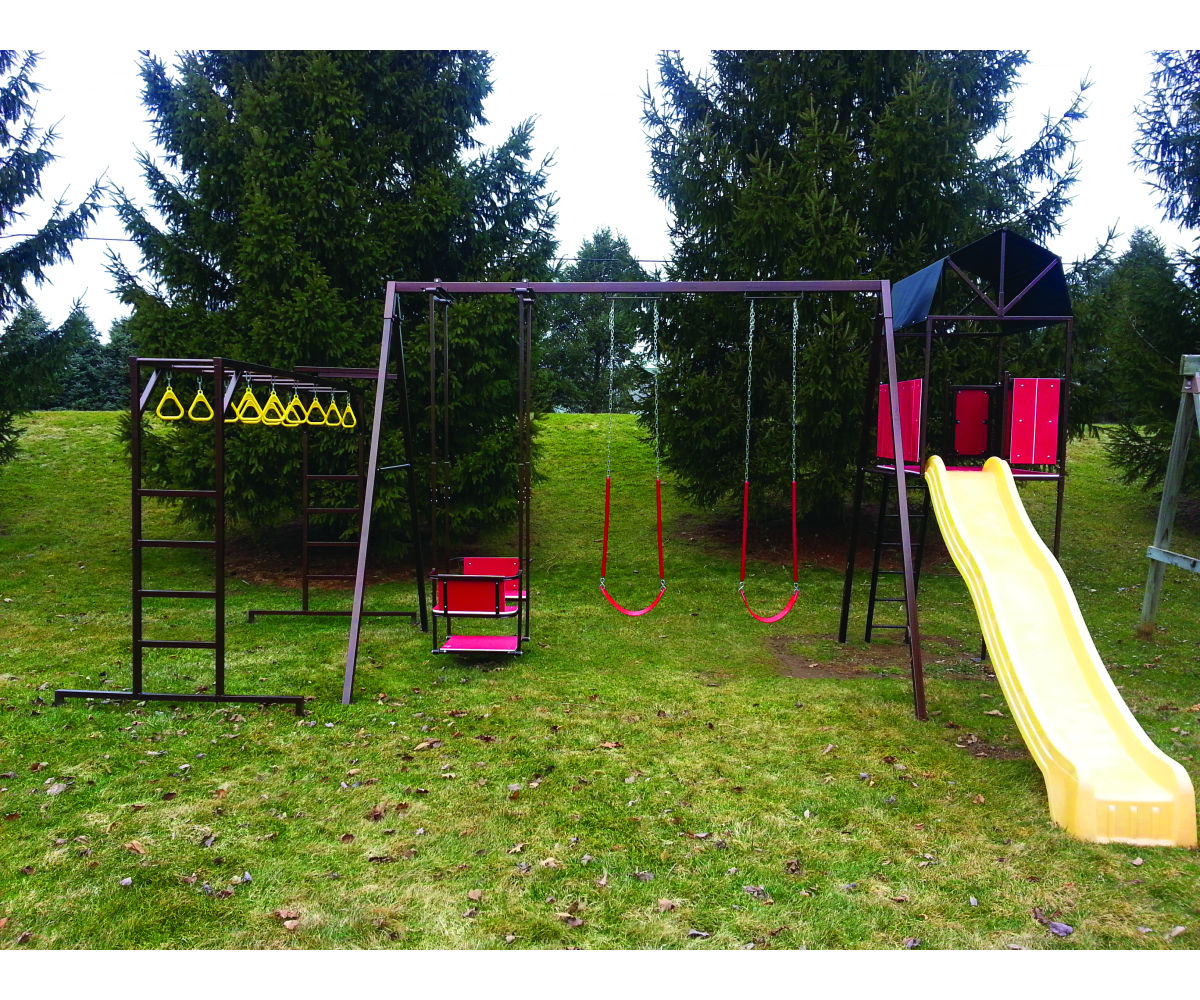 10′ High 3 Position A Frame 36″x48″ Platform with Canvas 10′ Slide 10′ Monkey Bars with Loops