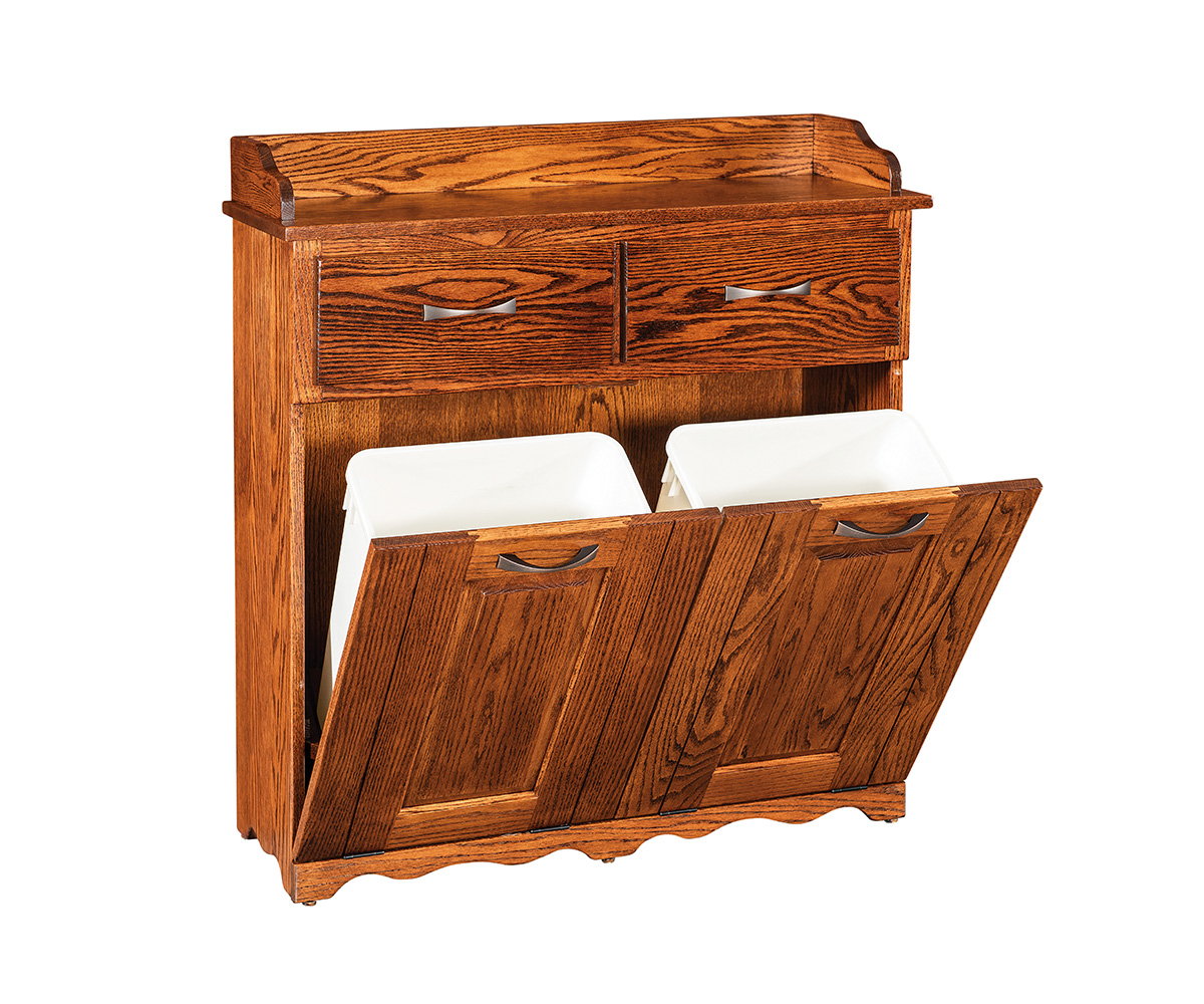 Features: • Dovetailed drawers • Full extension drawer slides • Two 35 qt trash cans fit inside • Front panel tilts forward for easy access