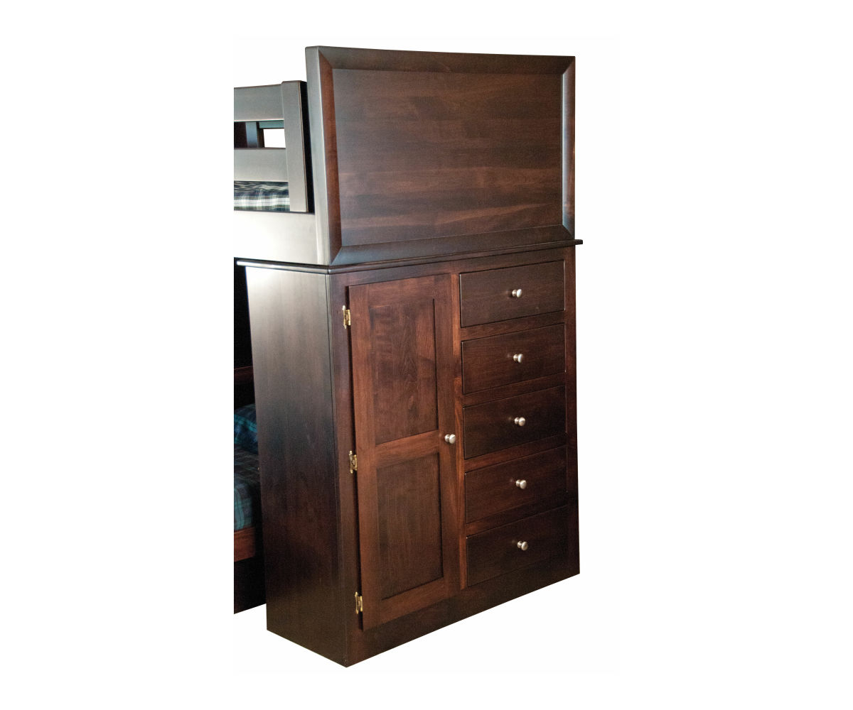 Features: Twin bed on the top of the loft Bookcase twin in the base with touch lights Dovetailed drawer in the base of the twin bed Ten dovetailed drawers in the loft frame Drawers have full extension slides Closet door in the side of the loft frame