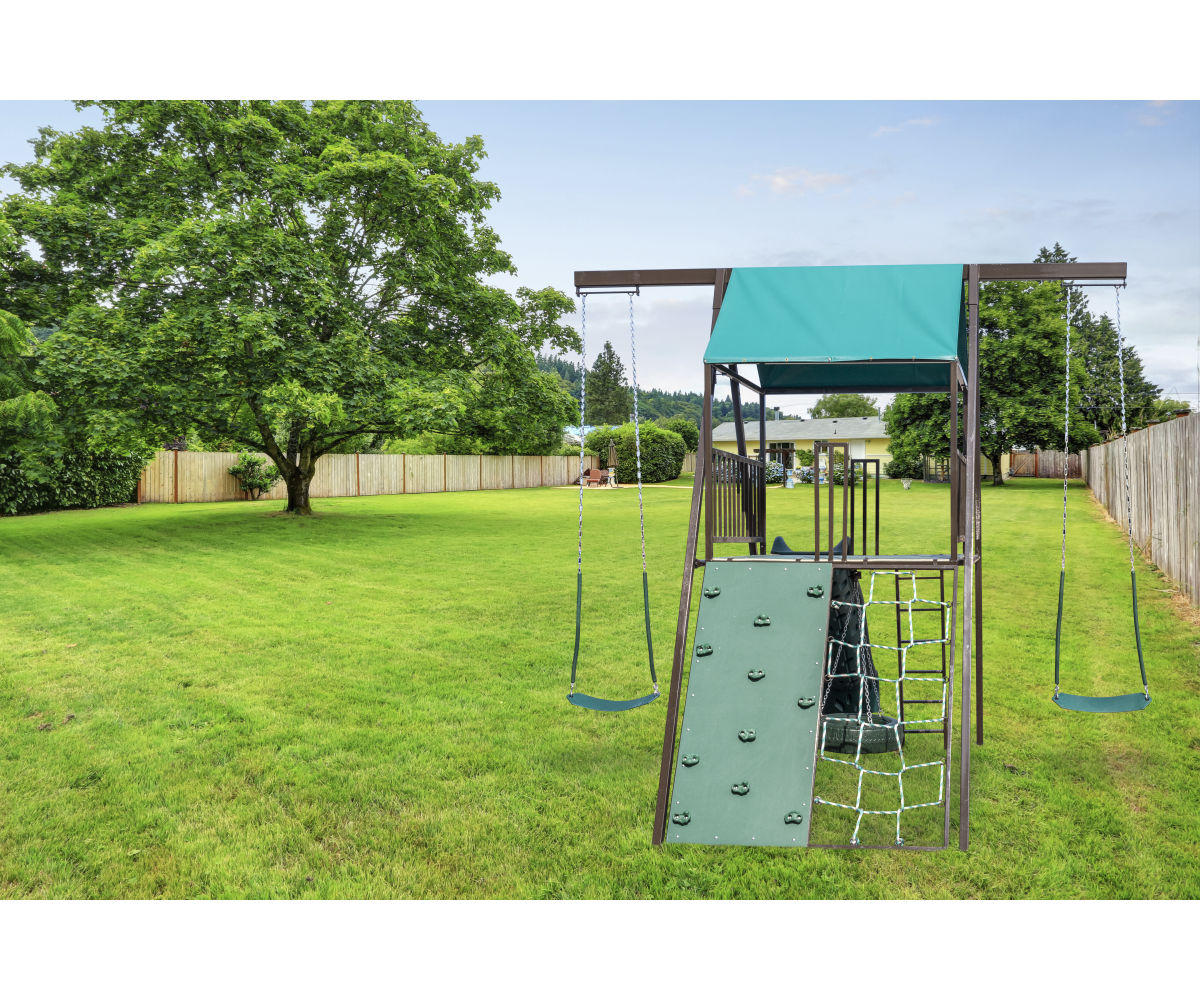 12′ High 3 Position A Frame 5’x5′ Platform 5′ Rock Climb Rope Climb 10′ Slide