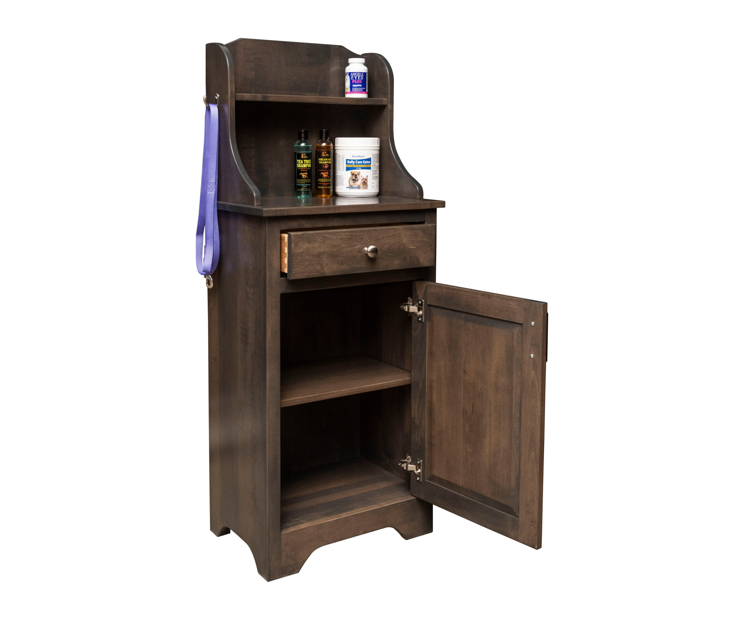 • Side hooks and shelf for various pet related items