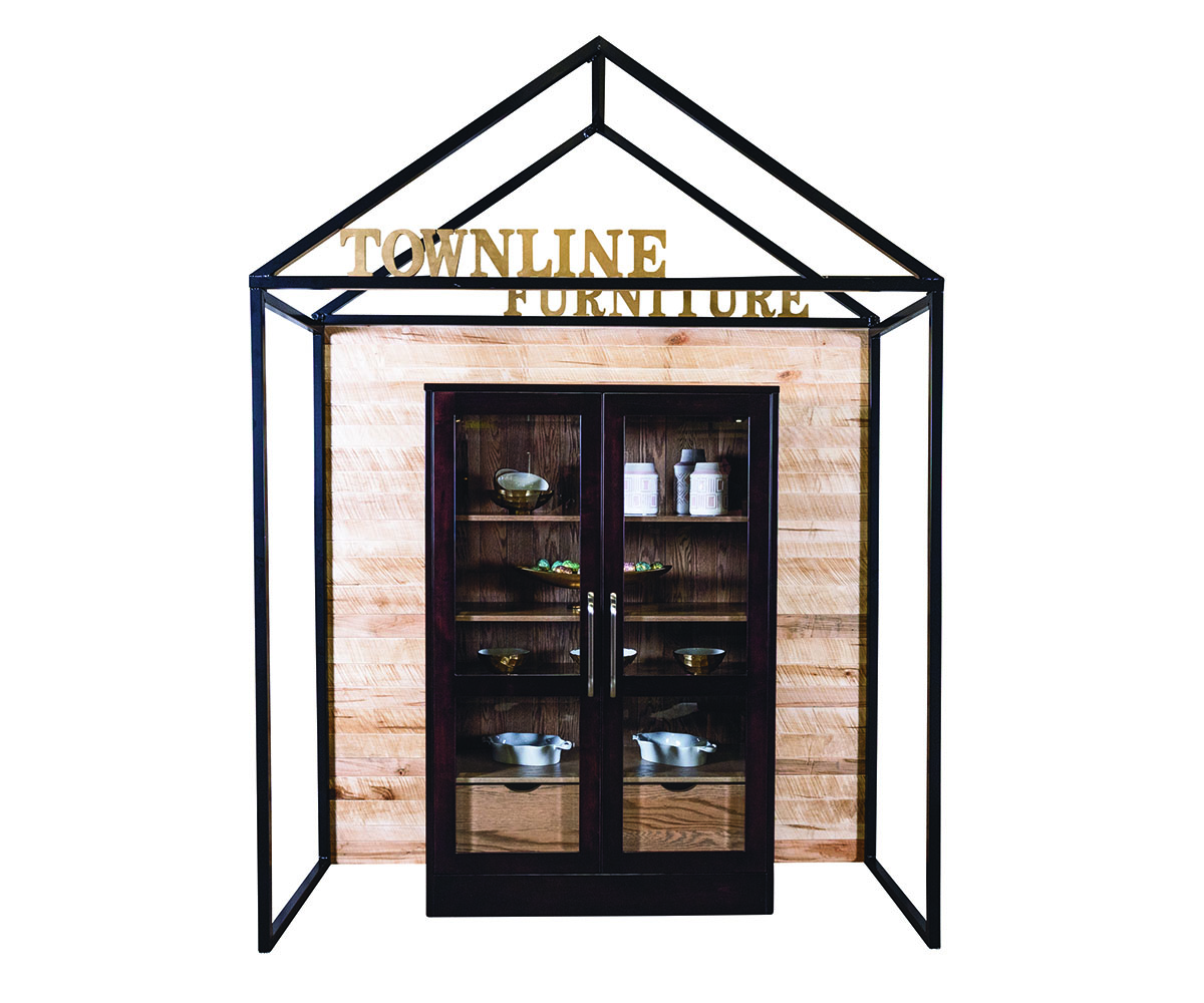 Features: • Beveled glass doors • Shiplap back • Three adjustable wood shelves • Two pull out drawers in the bottom